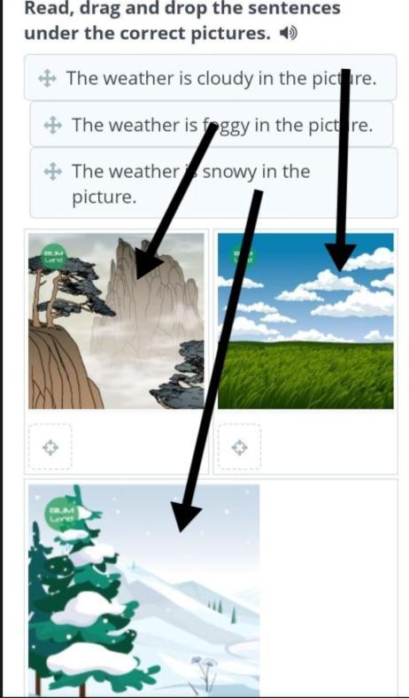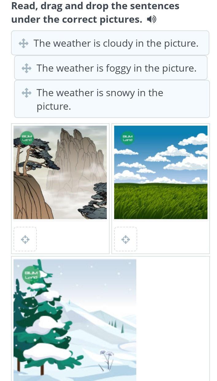 Read, drag and drop the sentences under the correct pictures. The weather is cloudy in the picture. The weather is foggy in the picture. The weather is snowy in the picture.