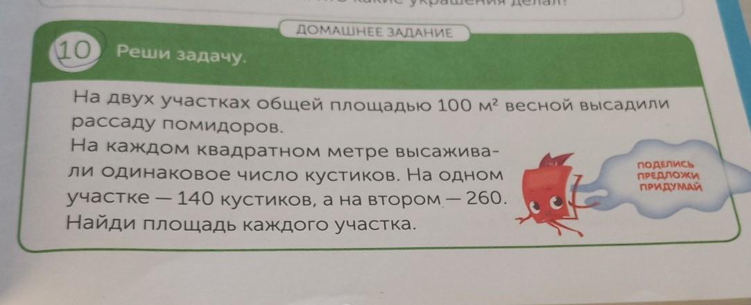 ДОМАШНЕЕ ЗАДАНИЕ 10 Реши задачу. На двух участках общей площадью 100 м² весной высадили рассаду помидоров. На каждом квадратном метре высажива- ли одинаковое число кустиков. На одном участке - 140 кустиков, а на втором-260. Найди площадь каждого участка. СКИНЬТЕ ФОТО!