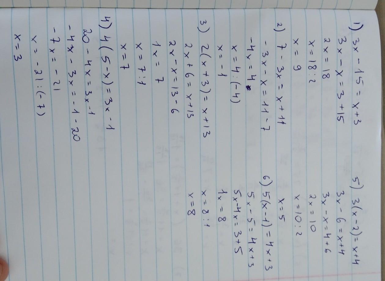 59. Решите уравнения: 1) 3x - 15 = x + 3; 2) 7 - 3x = x + 11; 3) 2(x + 3) = x + 13; 4) 4(5 - x) = 3x - 1; 5) 3(x - 2) = x + 4; 6) 5(x - 1) = 4x + 3.