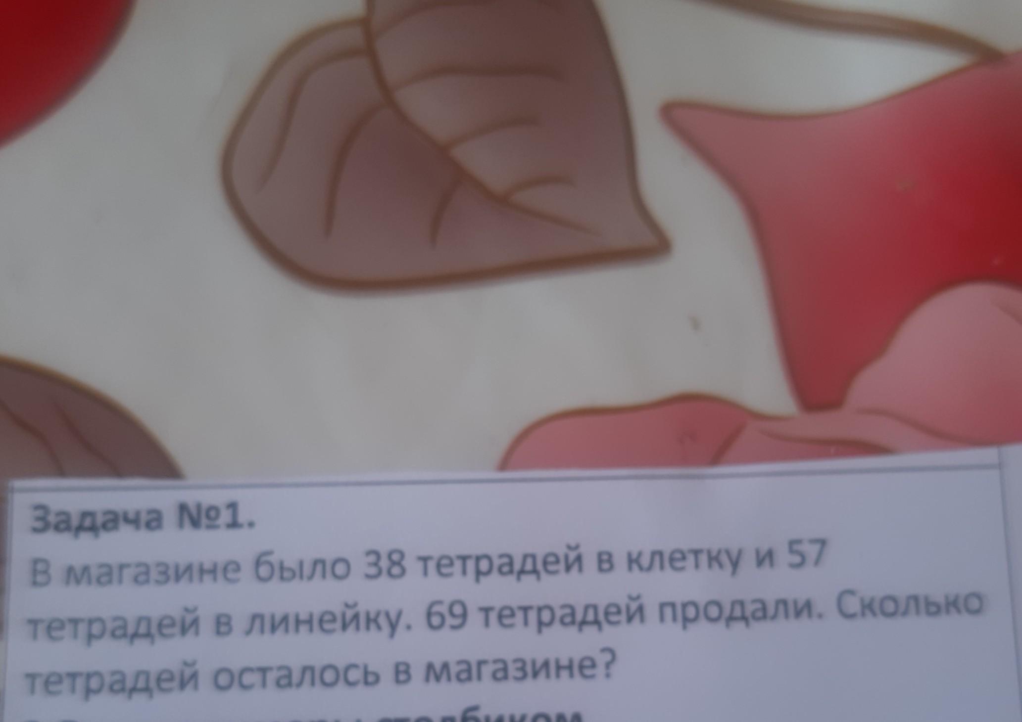 Задача №1. В магазине было 38 тетрадей в клетку и 57 тетрадей в линейку. 69 тетрадей продали. Сколько тетрадей осталось в магазине? столбиком