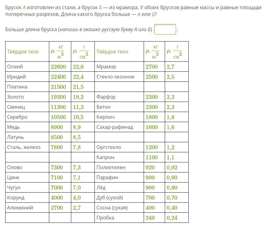 Больше длина бруска (напиши в окошко русскую букву А или Б) .
