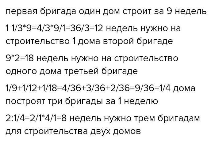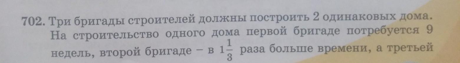 702. Три бригады строителей должны построить 2 одинаковых дома. На строительство одного дома первой бригаде потребуется 9 недель, второй бригаде - в 1 1 раза больше времени, а третьей 3
