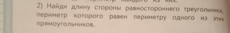 2) Найди длину стороны равностороннего треугольника, периметр которого равен периметру одного из этих прямоугольников.