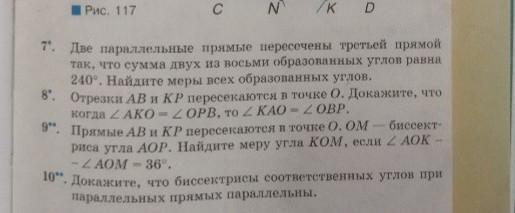 Если сумма двух углов равна 240 градусам, значит это соответственные углы, значит каждый из них равен по 120 градусов. Вертикальные с ними будут тоже равны 120 градусов. остальные четыре по 60 градусов