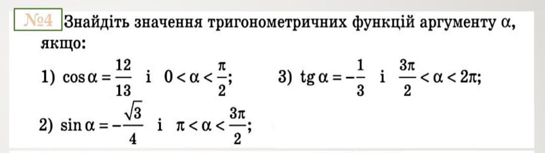 Допоможіть будь ласка!!! Знайдіть значення тригонометричних функцій аргументу альфа якщо: (дивись фото)