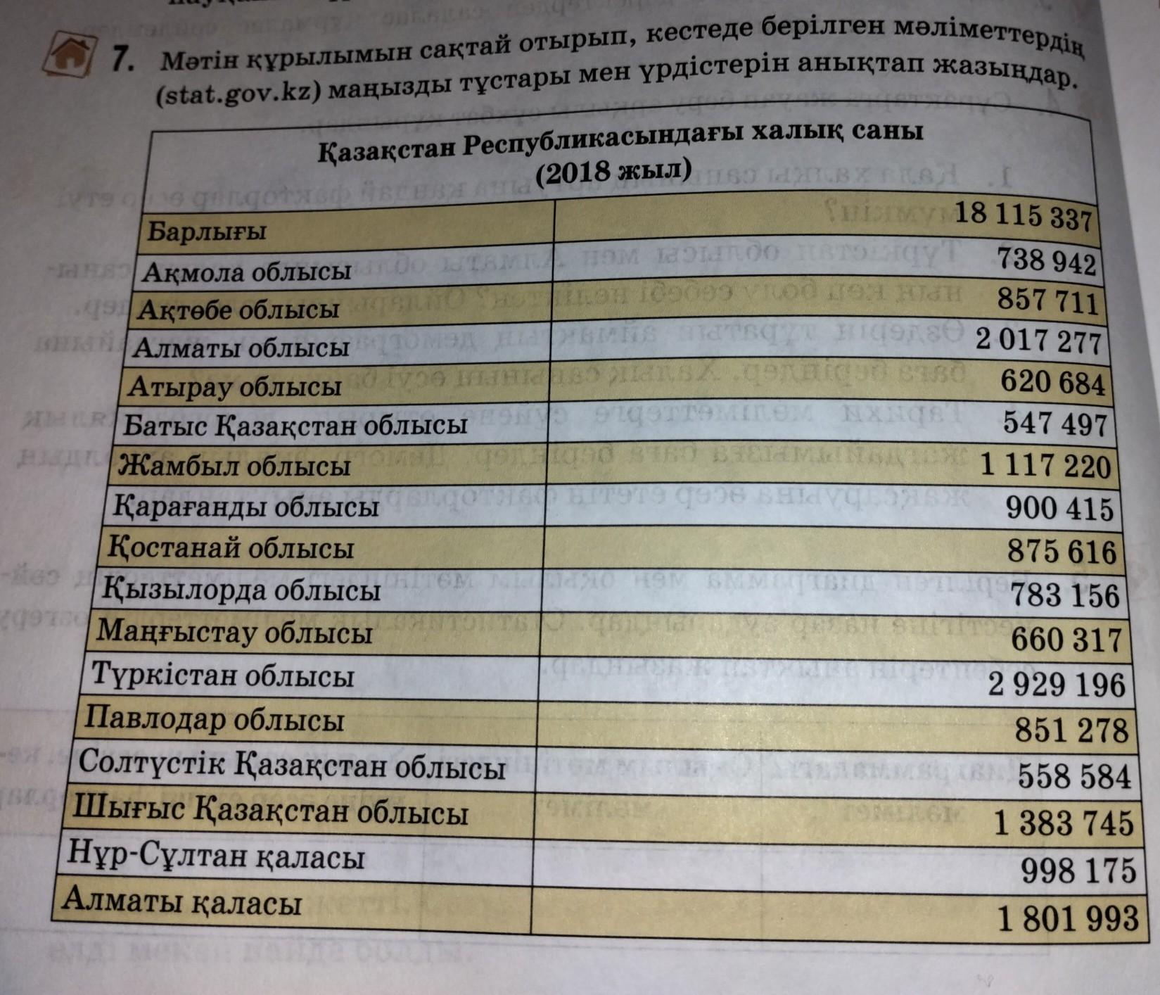7. Мәтін құрылымын сақтай отырып, кестеде берілген мәліметтердін (stat.gov.kz) манызды тұстары мен үрдістерін анықтап жазындар.