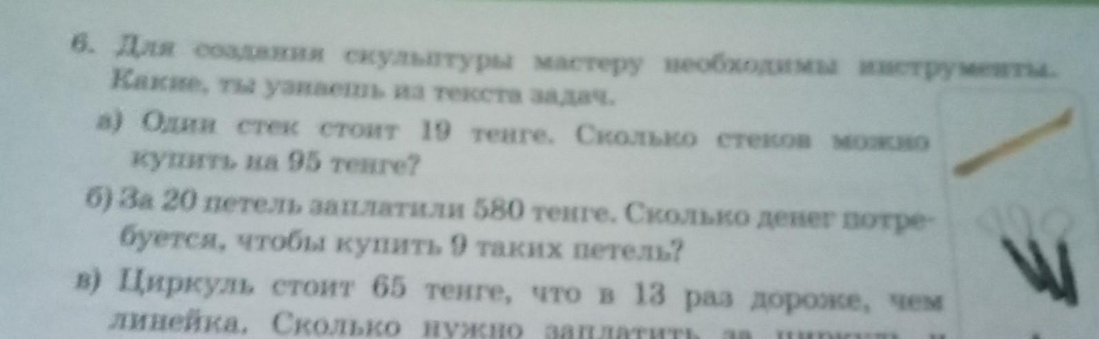 6. Для создания скульптуры мастеру необходимы инструменты. Какие, ты узнаешь из текста задач. a) Один стек стоит 19 тенге. Сколько стеков можно купить на 95 тенге? б) за 20 петель заплатили 580 тенге. Сколько денег потре- буется, чтобы купить 9 таких петель? в) Циркуль стоит 65 тенге, что в 13 раз дороже, чем линейка. Сколько нужно заплатить за циркуль и линейку? г) Деревянный стек стоит 19 тенге, а металлический 76 тенге. Во сколько раз металлический стек дороже деревянного? >1