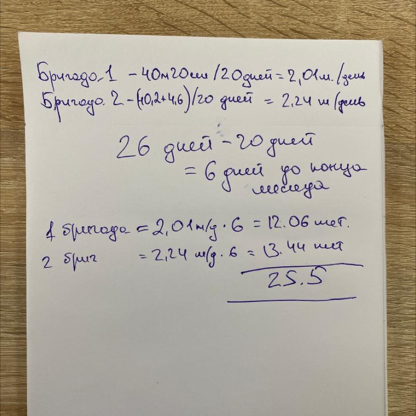 515. Две бригады строителей метро должны проложить за месяц 100 м тоннеля. За 20 дней одна бригада проложила 40 м 20 см, другая - на 4 м 60 см больше. На сколько больше метров тоннеля проложат бригады, работая с той же производительностью до конца месяца? Справка. В месяце 26 рабочих дней.