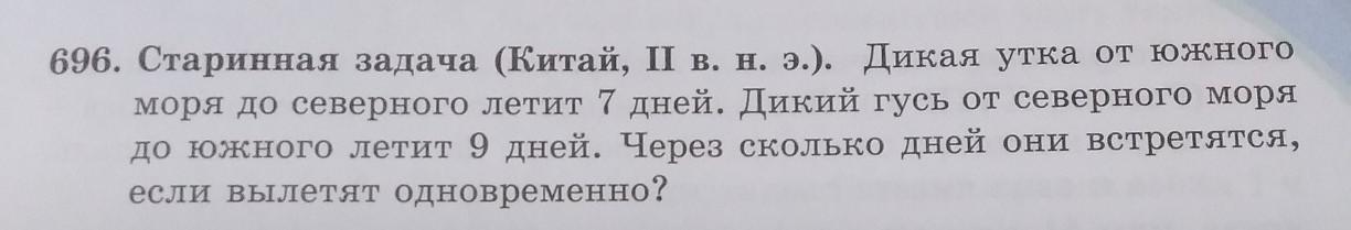 696. Старинная задача (Китай, ІІ в. н. э.). Дикая утка от южного моря до северного летит 7 дней. Дикий гусь от северного моря до южного летит 9 дней. Через сколько дней они встретятся, если вылетят одновременно?