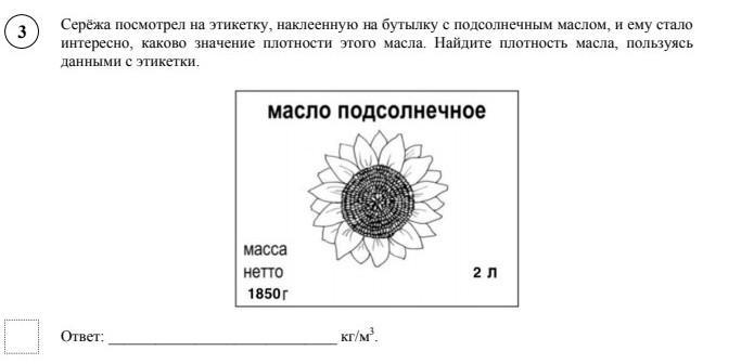 3 Серёжа посмотрел на этикетку, наклеенную на бутылку с подсолнечным маслом, и ему стало интересно, каково значение плотности этого масла. Найдите плотность масла, пользуясь данными с этикетке
