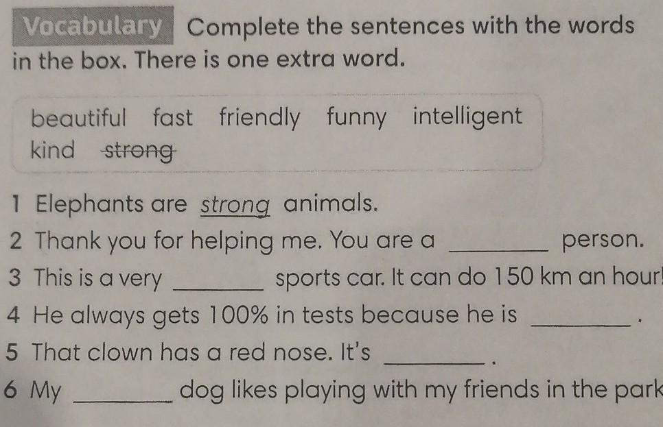 1 Vocabulary Complete the sentences with the words in the box. There is one extra word. beautiful fast friendly funny intelligent kind strong 1 Elephants are strong animals. 2 Thank you for helping me. You are a 3 This is a very 4 He always gets 100% in tests because he is 5 That clown has a red nose. It's 6 My _person. sports car. It can do 150 km an hour! dog likes playing with my friends in the park.
