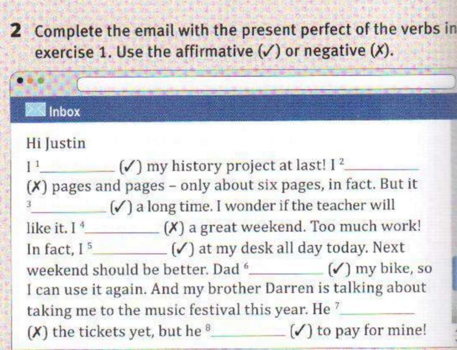 1 have finished 2 haven't written 3 has taken 4 haven't had 5 have been 6 has mended 7 hasn't bought 8 has promised
