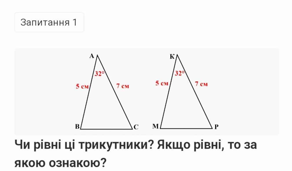 Треугольники равны по 1 признаку равенства треугольников-по двум сторонам и углу между ними