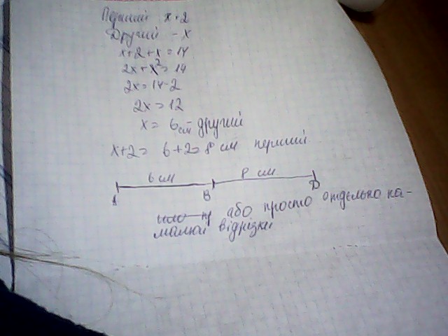 накресли два відрізки так, щоб один був довший ніж другий на 2 см, а разом вони складали відрізок завдовжки 14 см нужно само решение!