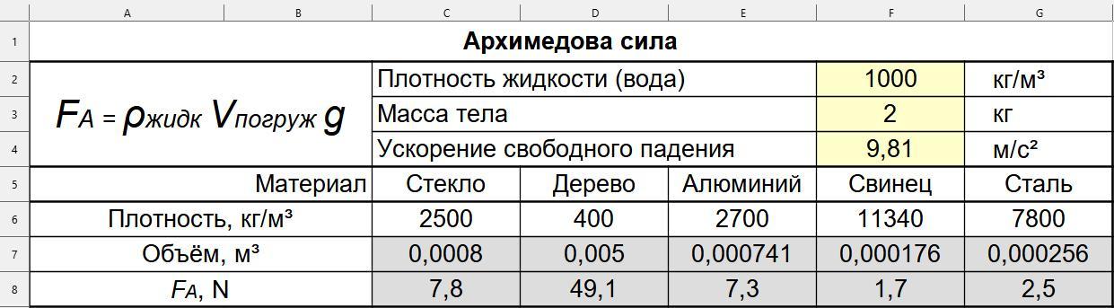 Кстати, можно дополнить эту таблицу расчётом веса тела (тут будет чуть меньше 20 Н). Сравнив этот вес с силой Архимеда (выталкивающей силой) для каждого образца материала, мы увидим, что она сможет удержать на плаву только дерево. Остальные образцы материалов утонут, т.к. их вес больше чем сила Архимеда, действующая на них.