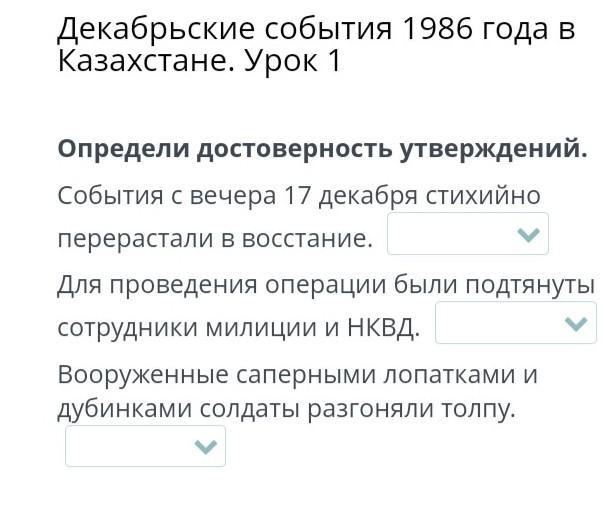 ОНЛАЙН МЕКТЕП Определи достоверность утверждений. События с вечера 17 декабря стихийно перерастали в восстание. Для проведения операции были подтянуты сотрудники милиции и НКВД. Вооруженные саперными лопатками и дубинками солдаты разгоняли толпу.