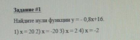 Задание #1 Найдите нули функции у=-0,8x+16. 1)x=202)x=-203) x=24)x=-2