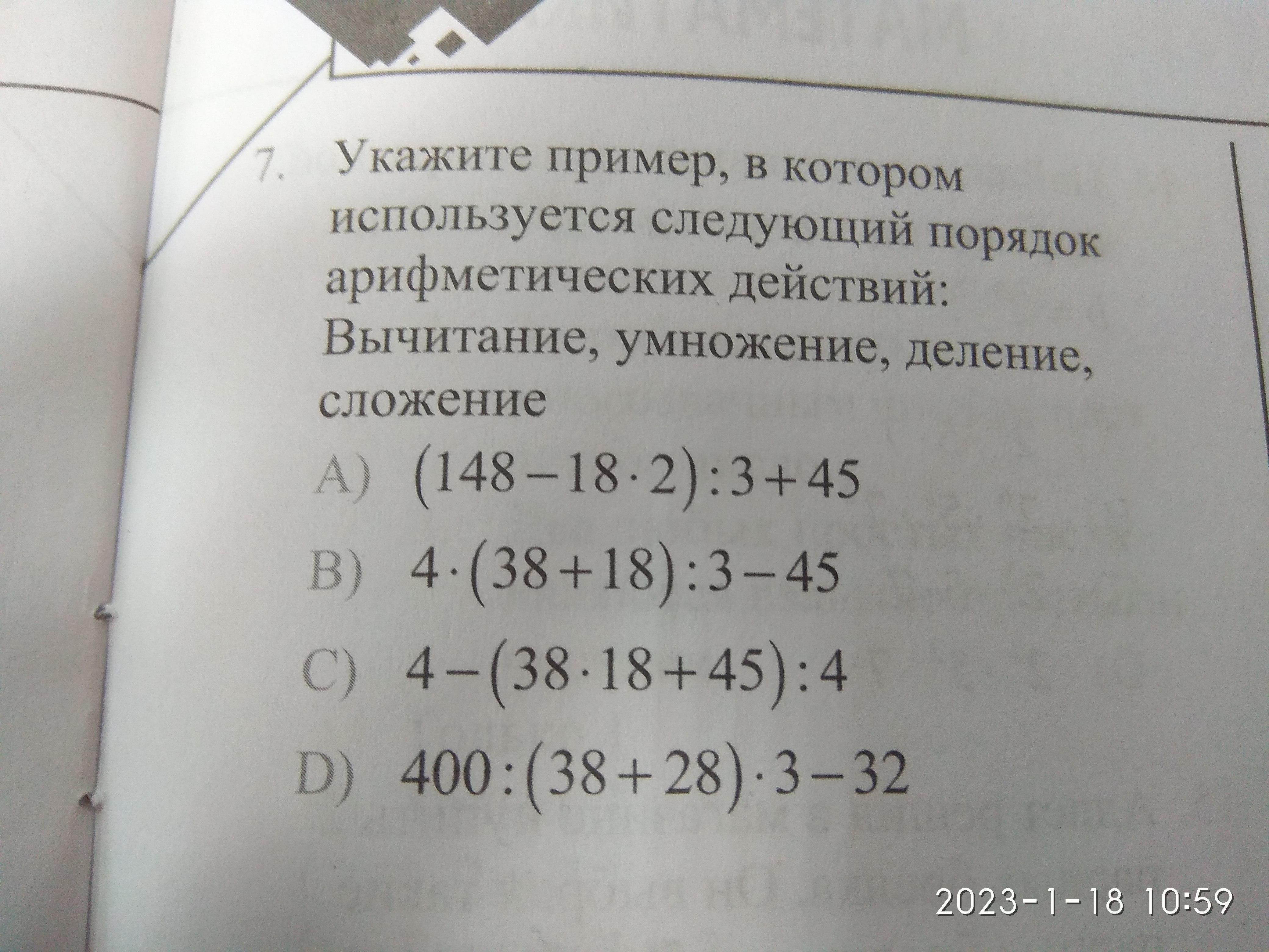 первое действие делается в скобках, в варианте а есть вычитание потом умножение действия в скобках закончились дальше мы делим и складываем.