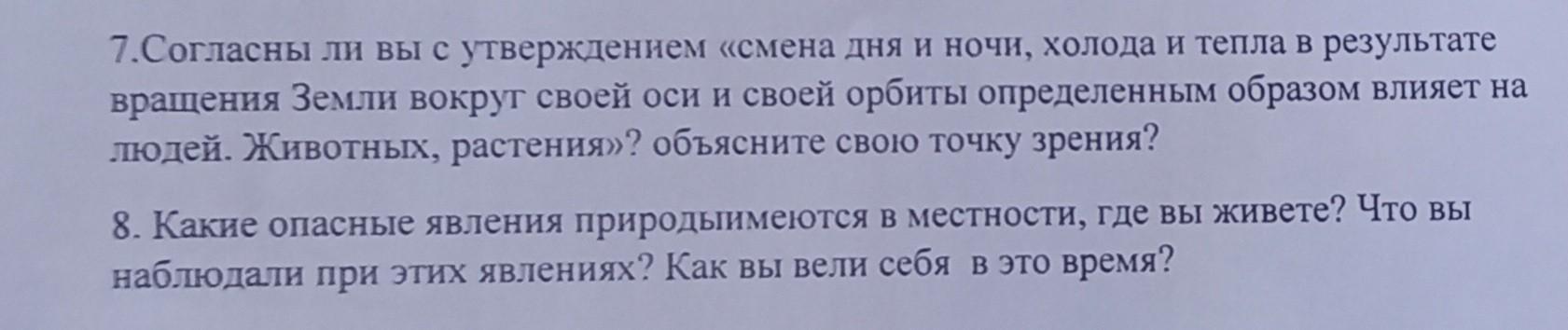 7.Согласны ли вы с утверждением «смена дня и ночи, холода и тепла в результате вращения Земли вокруг своей оси и своей орбиты определенным образом влияет на людей. Животных, растения»? объясните свою точку зрения? 8. Какие опасные явления природыимеются в местности, где вы живете? Что вы наблюдали при этих явлениях? Как вы вели себя в это время?