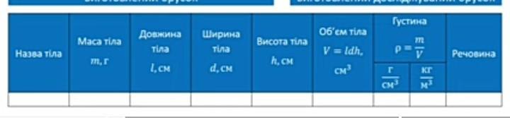 Назва тiла Маса тіла т, г Довжина тiла 1, см Ширина Tina d,cM Висота тіла h, CM Об'ем тiла V = ldh, CM³ Густина CM³ m V KT M³ Речовина