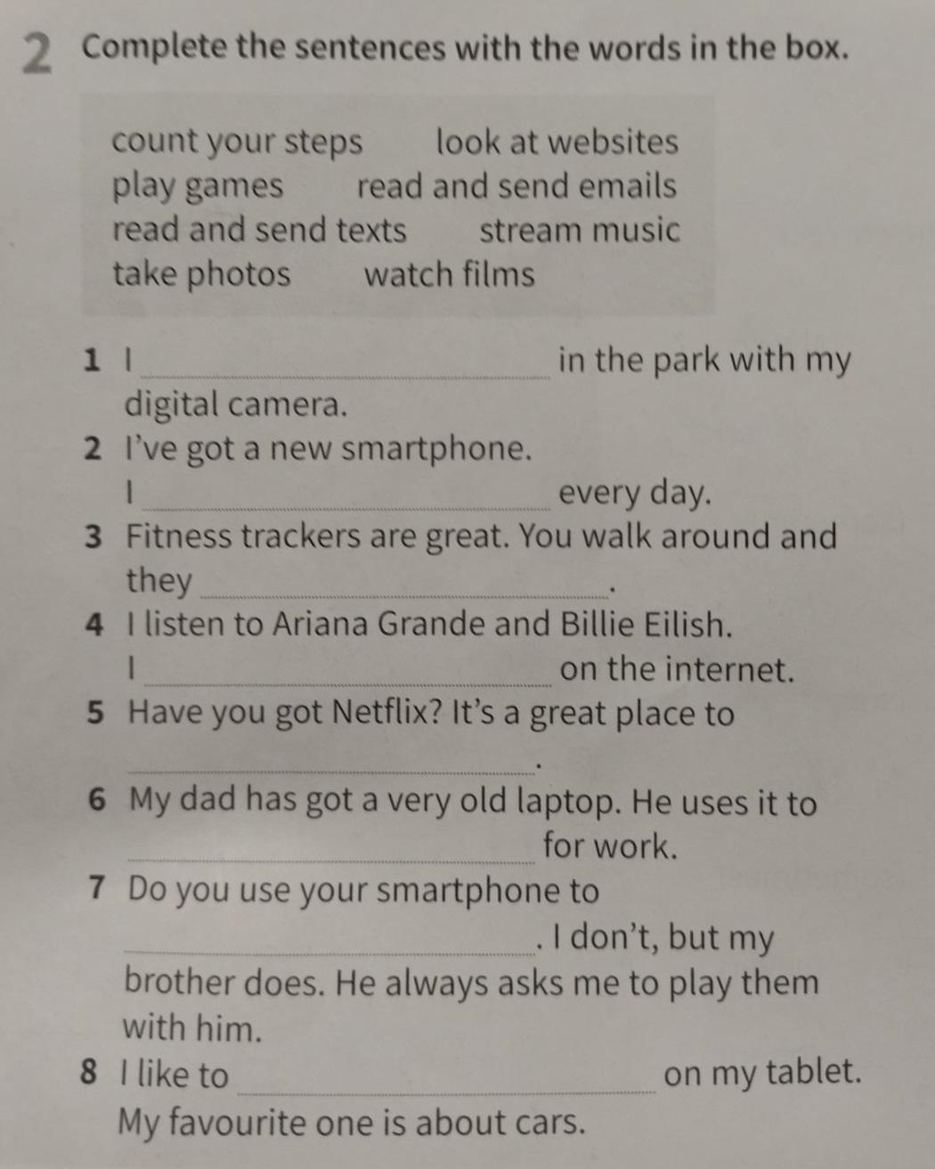 2 Complete the sentences with the words in the box. count your steps play games read and send texts take photos 1 1 look at websites read and send emails stream music watch films digital camera. 2 I've got a new smartphone. 1 in the park with my every day, 3 Fitness trackers are great. You walk around and they 4 I listen to Ariana Grande and Billie Eilish. 1 on the internet. 5 Have you got Netflix? It's a great place to 6 My dad has got a very old laptop. He uses it to for work. 7 Do you use your smartphone to I don't, but my brother does. He always asks me to play them with him. 8 I like to My favourite one is about cars. on my tabl.