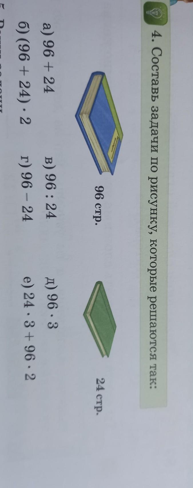 4. Составь задачи по рисунку, которые решаются так: a) 96 + 24 6) (9624) 2 . 96 стр. в) 96 : 24 г) 96 - 24 д) 96 - 3 e) 24 . 3 + 96 - 2
