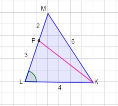 В треугольнике KLM KL = 4, KM = 6 , а на стороне LM выбрана точка Р так что LР = 3, РМ = 2 . Найти длину отрезка КР.