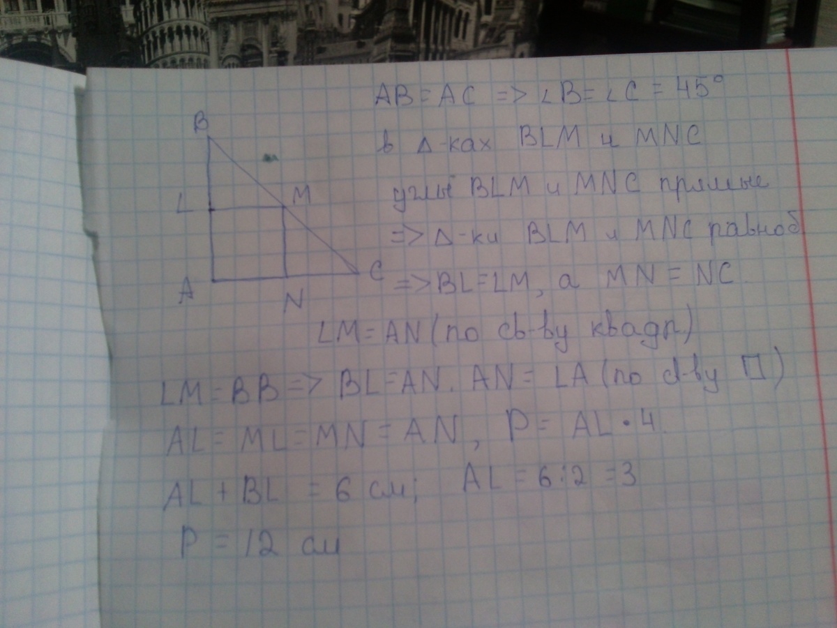 у рівнобедрений прямокутний трикутник з катетом 6 см вписано квадрат так що прямий кут у них спільний. знайдіть периметр квадрата