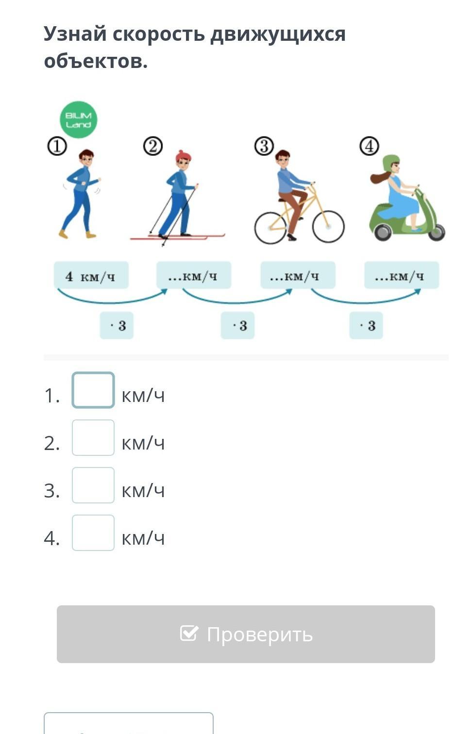 Узнай скорость движущихся объектов. ( 1. 2. 3. BILIM Land 4. 4 км/ч · 3 км/ч км/ч км/ч км/ч .км/ч (3 ...км/ч (4) ...км/ч 3