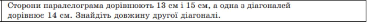Сторонни паралелограма 13см i 15см,а одна з дiагоналей дорiвнює 14см.