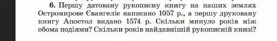 6. Першу датовану рукописну книгу на наших землях Остромирове Євангеліє написано 1057 р., а першу друковану книгу Апостол видано 1574 р. Скільки минуло рокiв мiж обома подіями? Скільки років найдавнішiй рукописній книзі?
