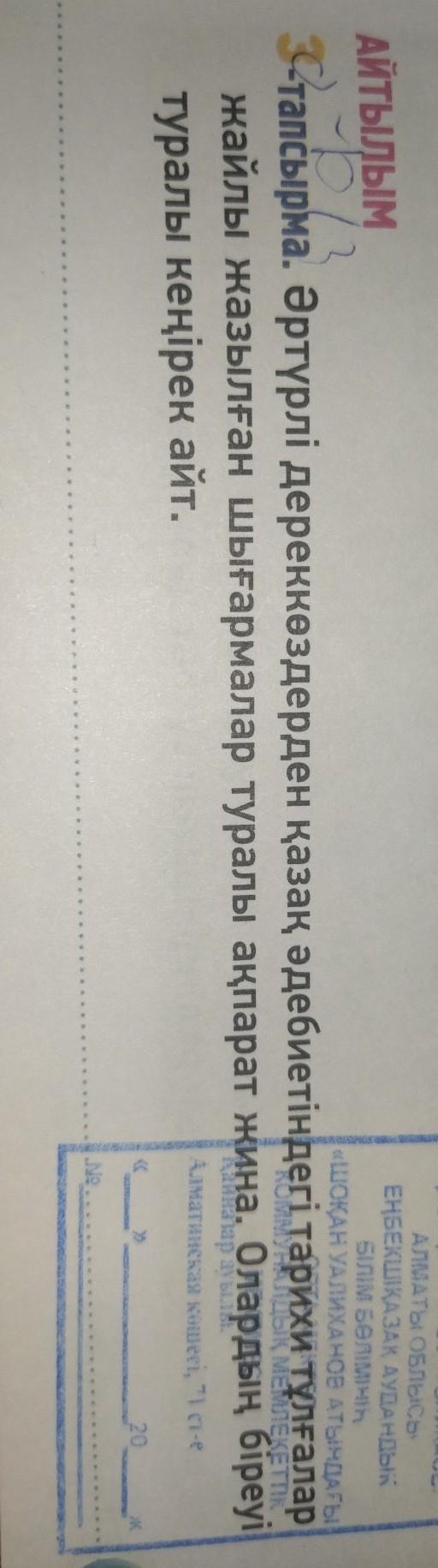 3-тапсырма. Әртурлi дереккездерден казак әдебиетіндегі тарихи тұлғалар Олардың біреуі жайлы жазылған шығармалар туралы акпарат жина.