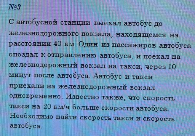 80км/ч Пошаговое объяснение: Допустим что скорость автобуса - х Тогда скорость такси - х+10 Тогда скорость автобуса - 60/х Тогда скорость такси 60/(x+10) - 5 мин=1/12 ч 60/х=60/(х+10)+1/12 (60(х+10)-60х)/(х(х+10))=1/12 (60(х+10)-60х)/(х(х+10))=1/12 х^2+10х-7200=0 Д=28900 x1=(-10-170)/2=-90 - не подходит x2=(10+170)/2=80 км/ч скорость автобуса
