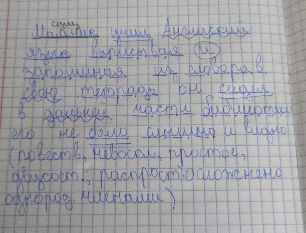 Мальчик учил английский язык выписывая и запоминая из словаря в свою тетрадь он сидел в дальной части библиотеки и его не было слышно и видно синтаксический разбор