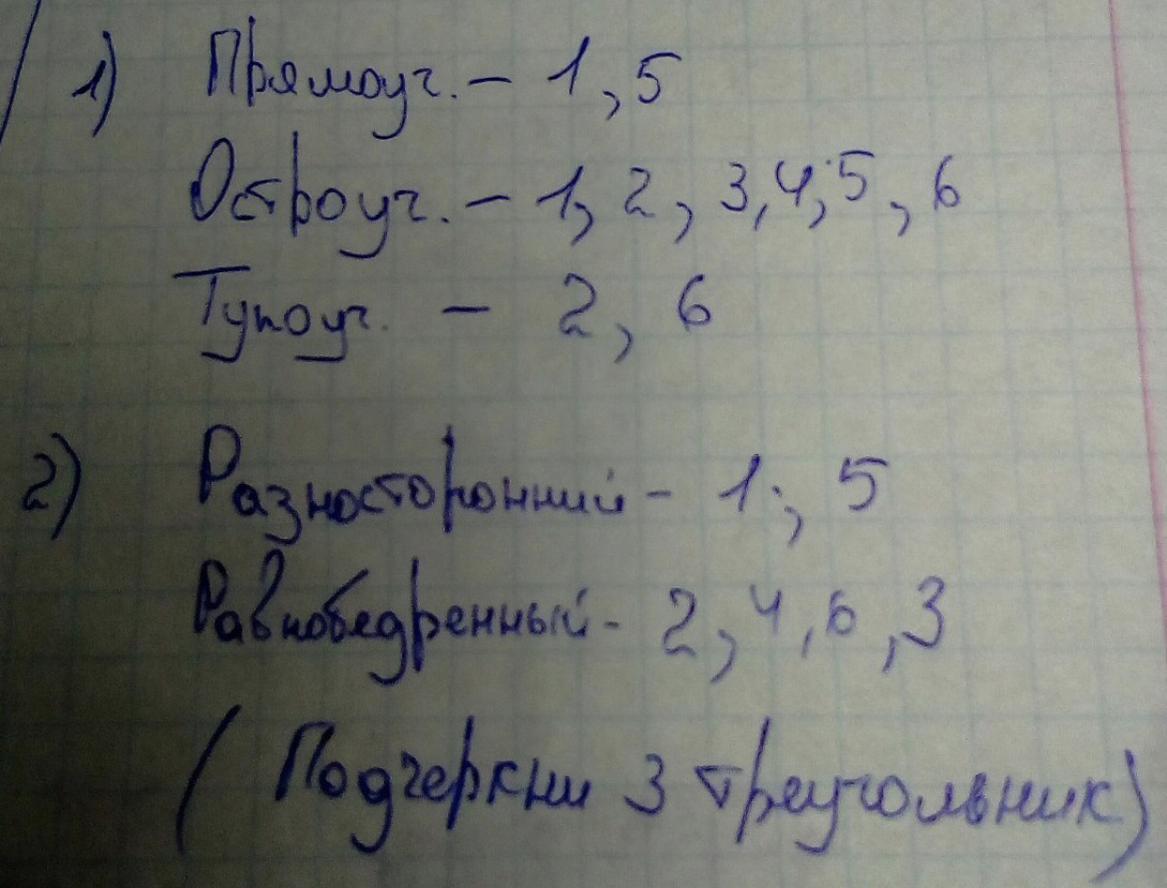 15. Разбей все треугольники за- Ha группы. Для этого пиши: 1) номера прямоугольных, остроугольных, ту- номера поугольных треугольников; разносто- Среди равнобедренных треугольников. ронних и номеров равнобедренных треугольников подчеркни номер равностороннего. 1 2 3 2) 5 A 6