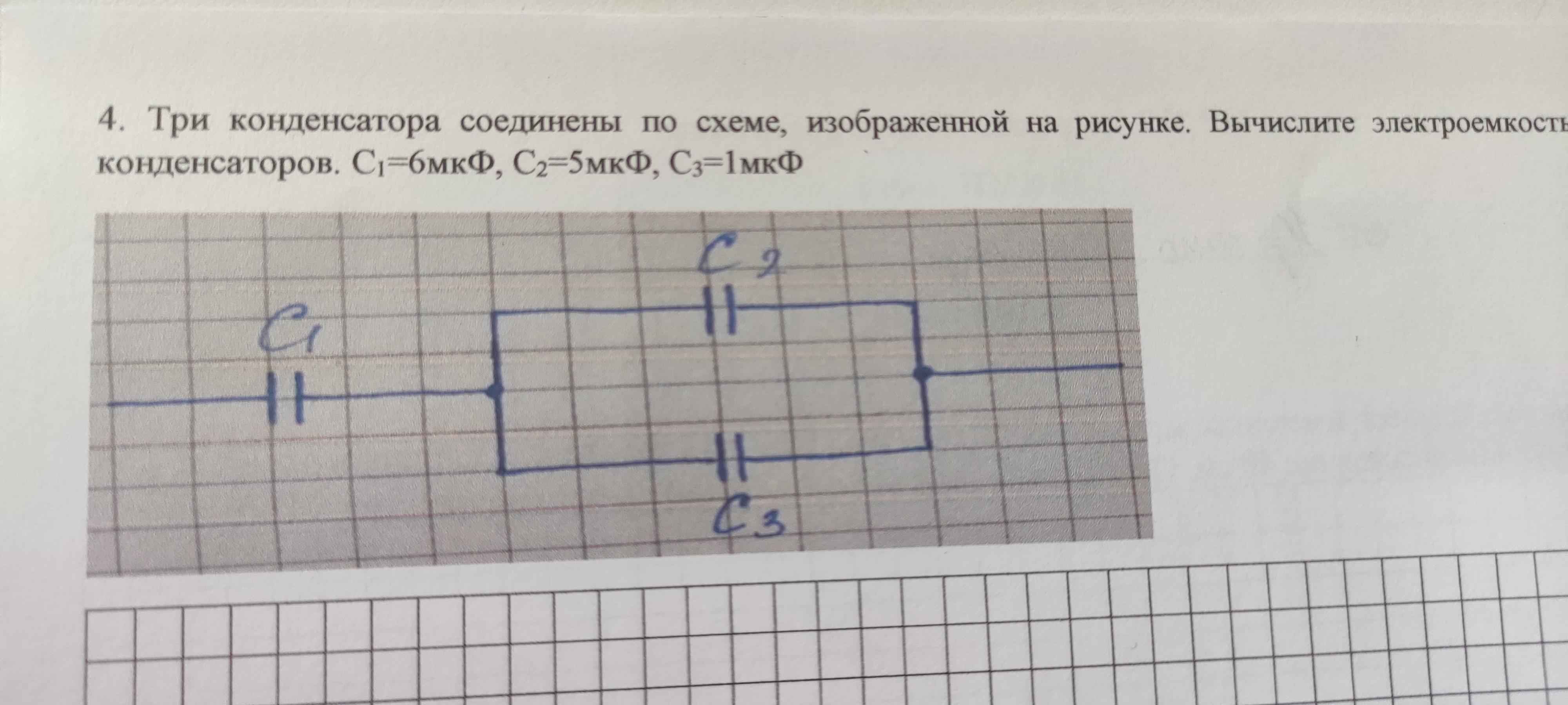 Три конденсатора соединены по схеме,изображённой на рисунке.Вычислите электроёмкость батареи конденсаторов.C1= 6мкФ,C2=2мкФ,C3=1мкФ