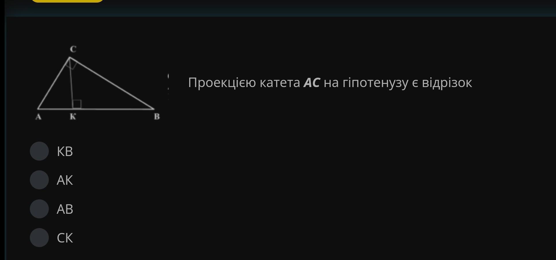 Проекція катета АС на гіпотенузу АВ є відрізок АК.