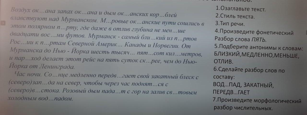 1.Озаглавьте текст. 2.Стиль текста. 3.Тип речи. 4.Произведите фонетический Разбор слова ПЯТЬ. 5.Подберите антонимы к словам БЛИЗКИЙ,МЕДЛЕННО,МЕНЬШЕ, ОТЛИВ. 6.Сделайте разбор слов по составу: ВОД...ПАД, ЗАКАТНЫЙ, ПЕРЕДВ...ГАЕТ 7.Произведите морфологический разбор числительных.