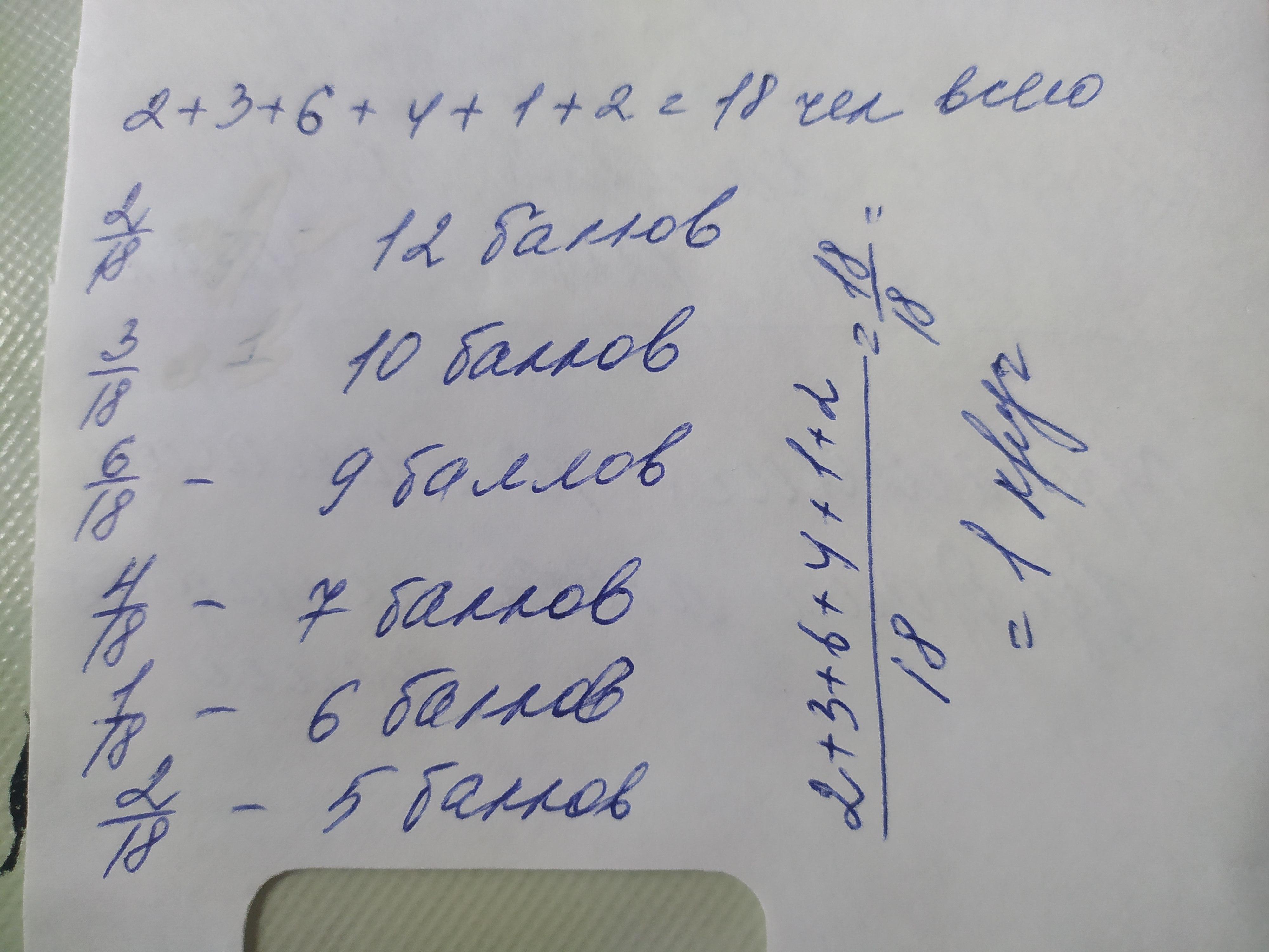 №3. Учнi 6-В класу отримали за самостійну роботу з математики такі оцінки: двоє учнів - по 12 балів, троє - по 10 балів, шестеро - по 9 балів, четверо - по 7 балів, один-6 балів, двоє - по 5 балів. Побудуйте відповідну кругову діаграму.