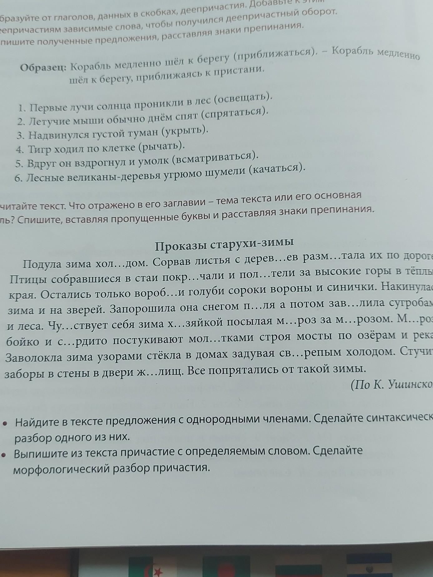 предложения с однородными членами и синтаксический разбор одного из них и ещё нужно выписать из текста причастия с определяемым словом и морфологический разбор причастия