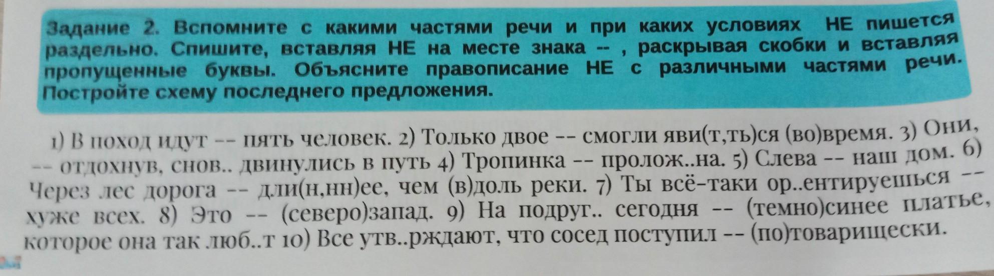 не отдохнув, снова двинулись в путь 4) Тропинка не проложена. 5) Слева не наш дом. 6) Через лес дорога не длиннее, чем вдоль реки. 7) Ты всё-таки ориентируешься не хуже всех. 8) Это не северо-запад. 9) На подруге сегодня