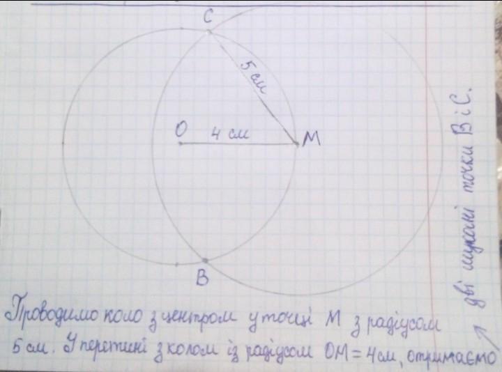 Накресліть коло, діаметр якого дорівнює 5 см. Позначте на колі точку М. Знайдіть на колі точки, віддалені від точки М на 2 см.