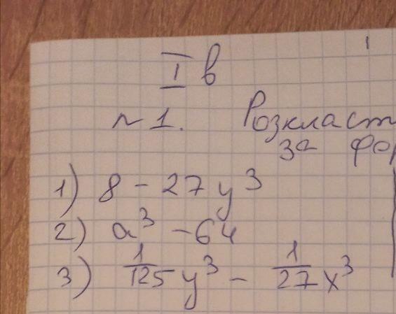 1/125у³-1/27х³=(1/5у-1/3х)(1/25у²+1/15ху+1/9х²)