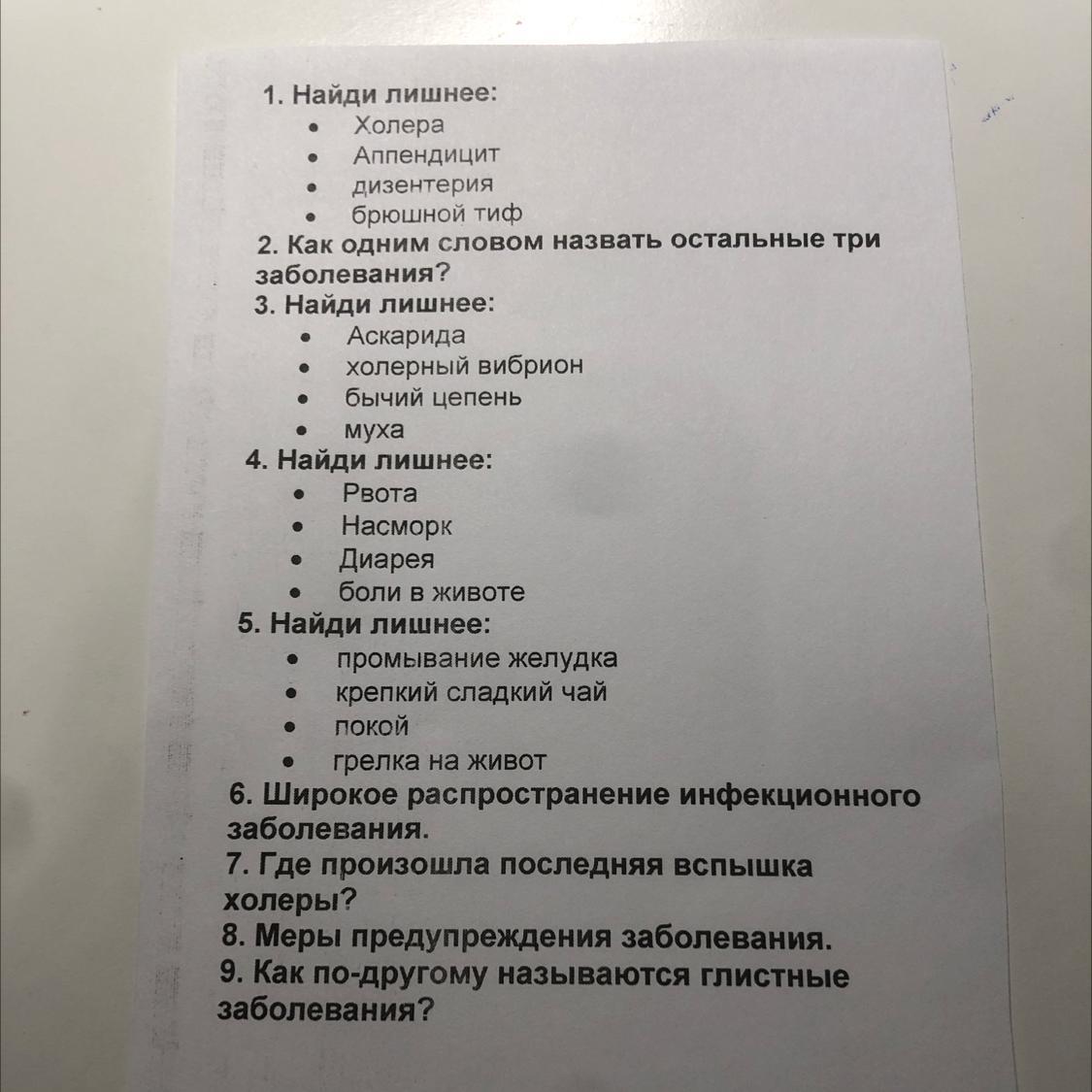 1 брюшной тиф 2честно не знаю 3муха 4боли в животе 5крепкий чай 6 вирус 7в Китае 8тут по разному у всех так что не знаю 9гельминтное заблоевагие