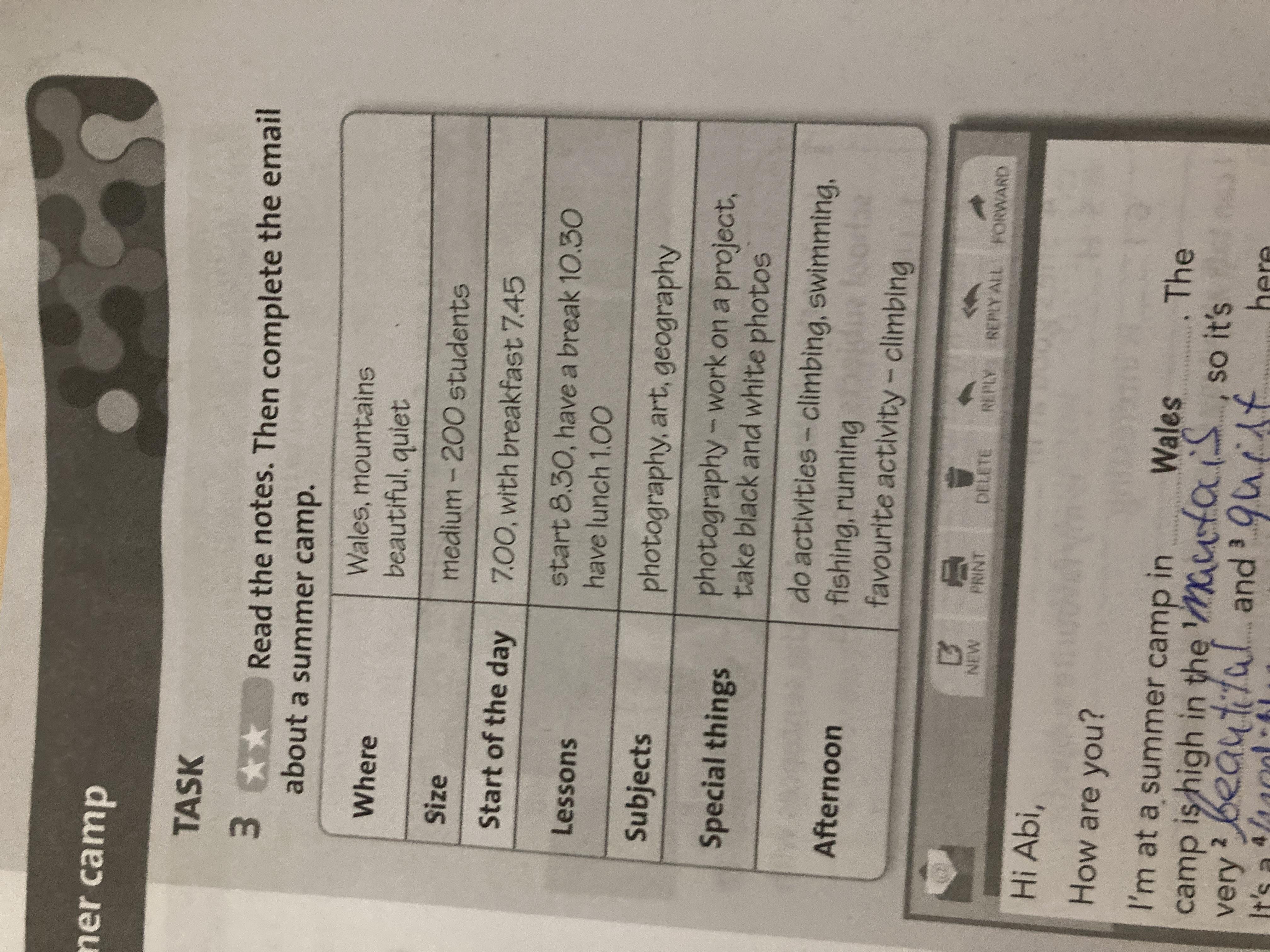 Subjects-photography, art, geography. Special things-photography-work on a preject, take black and white photos. Afternoon-Do activies-climbing, swimming, fishing, running. Favourite activies-swimming or climbing