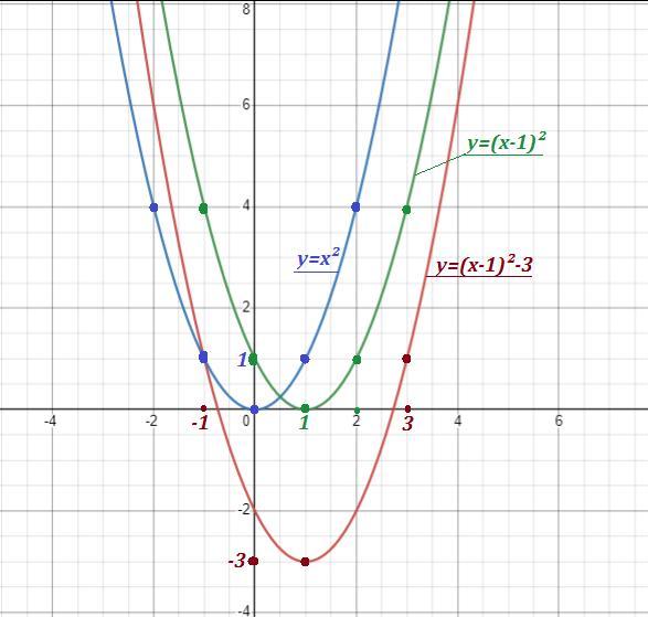 Чтобы построить график функции y=(x-1)²-3 , надо построить сначала график параболы y=x² , проходящий через точки (0;0) , (1;1) , (-1;1) ,