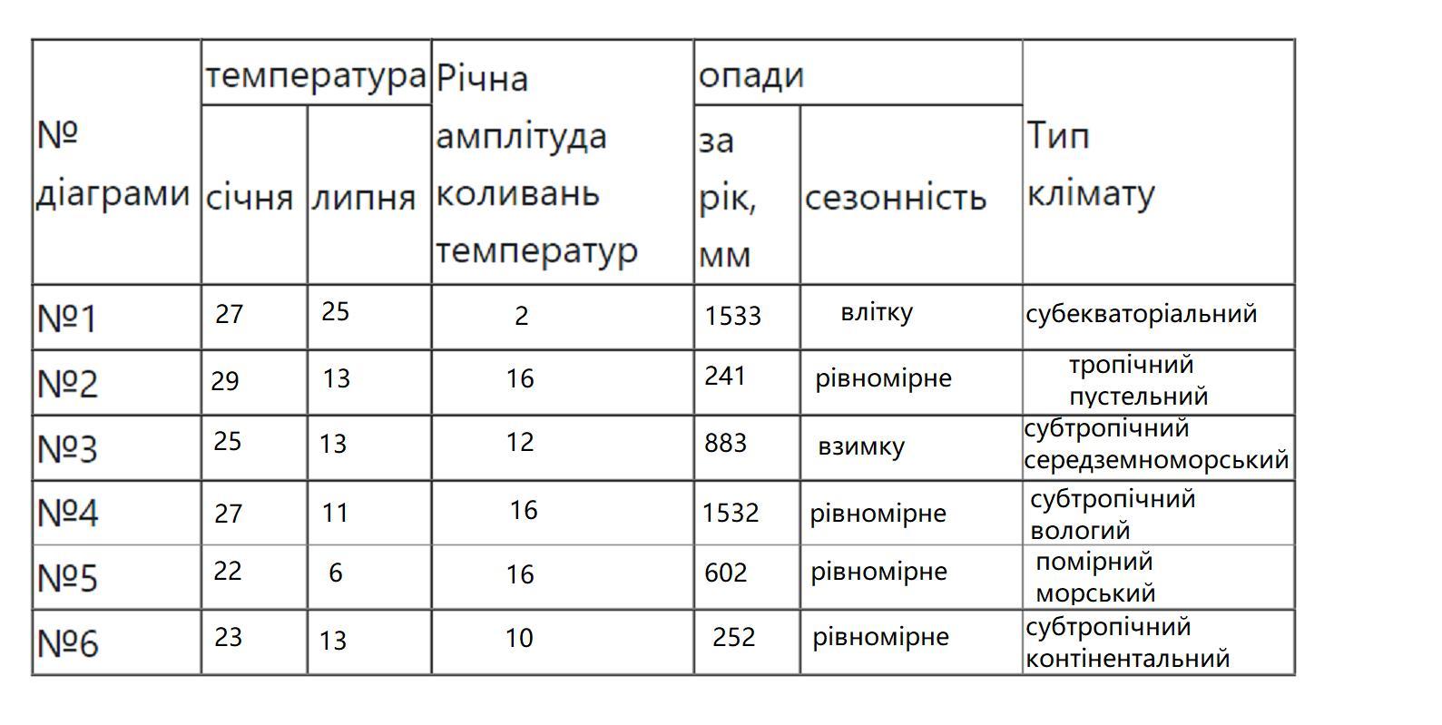 ОЧЕНЬ СРОЧНО!!!!!!! ПОМОГИТЕ ПОЖАЛУЙСТА!!!! ДАЮ 30 БАЛОВ?!!!!!!!!!!! СРОЧНО!!!!! Визначення типів клімату Австралії за кліматичними діаграмами Мета: пригадати порядок розшифровування кліматичних діаграм; за даними кліматичних діаграм встановлювати типи клімату Австралії. Використання карт:_кліматична карта Австралії, кліматичні пояси і області світу Завдання: проаналізувавши кліматичні діаграми, заповніть таблицю і визначте типи клімату. Практична робота № 8 ВИЗНАЧЕННЯ ТИПІВ КЛІМАТУ ЗА ДІАГРАМАМИ No діаграми сiчня INº1 №2 |No3 No4 No5 |№96 температура Річна липня амплітуда коливань температур опади за рік, MM сезонність КЛІМАТИЧНИМИ Тип клімату