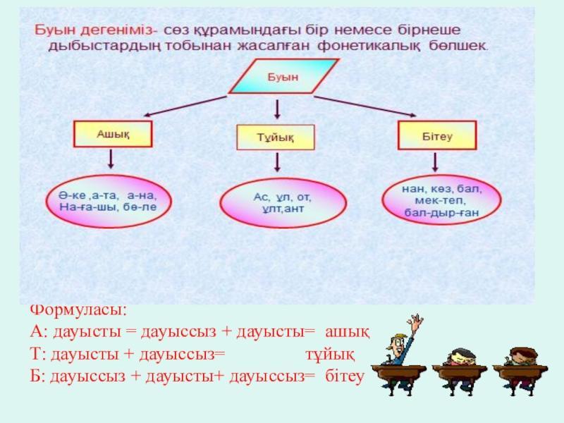 Тұйық буын. Дауыстыдан басталып, дауыссызға біткен буын тұйық буын деп аталады.Мысалы: аң, от, ән, ант, аспаз, орман.