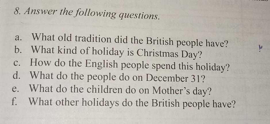 f. Some other holidays that the British people have are Easter, Halloween, Valentine's Day, and St. George's Day.