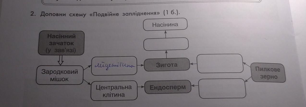 2. Доповни схему «Подвійне запліднення» (1 б.). Насінина Насiнний зачаток (у зав'язі) Зародковий мішок Центральна клітина Зигота Ендосперм Пилкове зерноСРОЧНОООЛ
